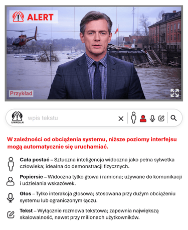 UWAGA.AI działa w sposób elastyczny i skalowalny – w zależności od liczby użytkowników i obciążenia systemu, automatycznie przełącza się między poziomami interfejsu: od pełnej postaci w interakcji wizualnej, przez popiersie, po tryby głosowy i tekstowy. Dzięki temu system pozostaje dostępny nawet przy ogromnym ruchu. Platforma przypomina, że każdy kryzys można przejść bez paniki – jeśli społeczeństwo jest przygotowane, poinformowane i połączone w jeden inteligentny ekosystem. GOTOWOŚĆ TO BEZPIECZEŃSTWO!